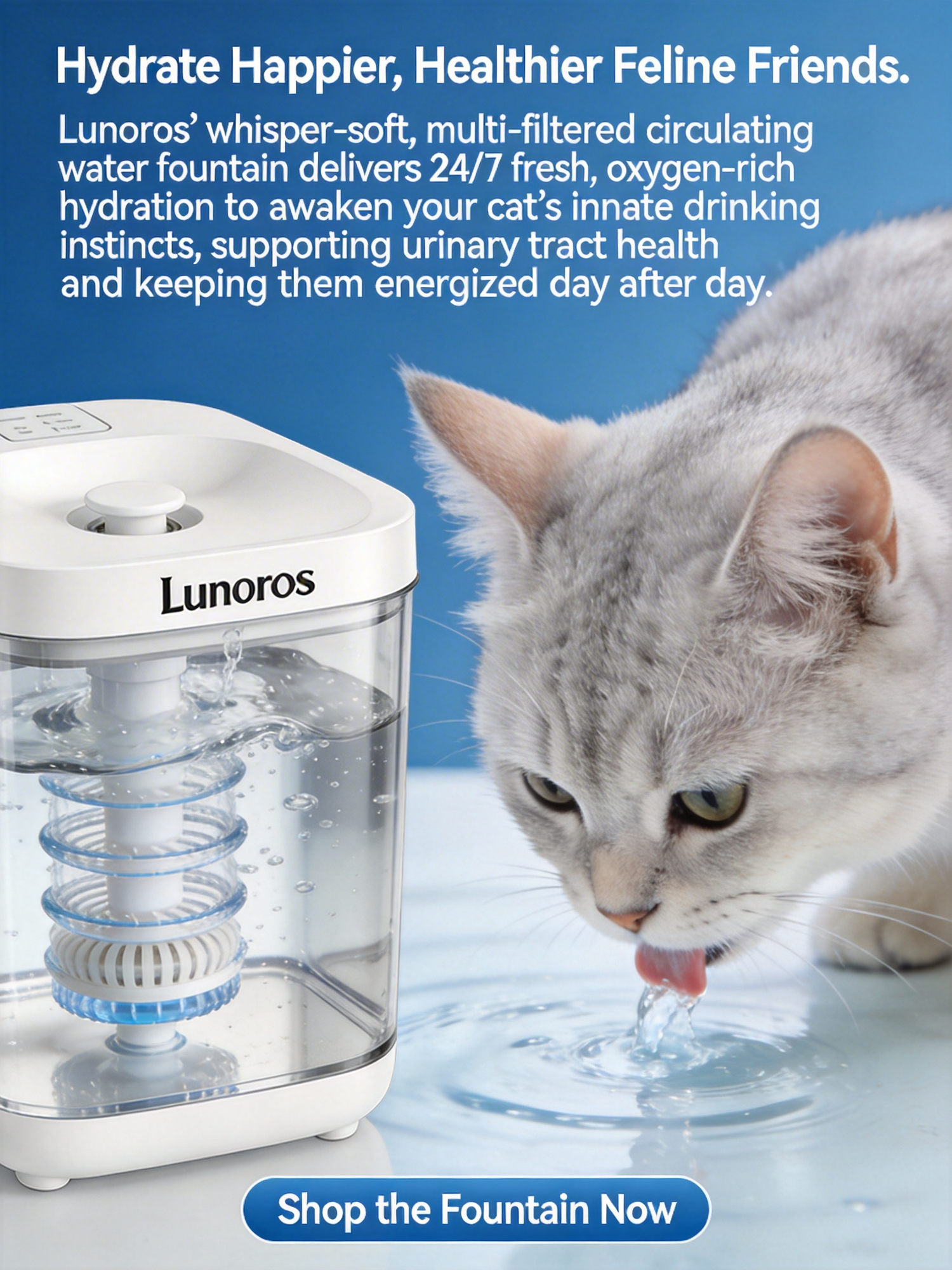 At lunorosĀ®, we believe every whiskered companion deserves a drinking experience tailored to their wild instincts. Our sleek, quiet cat water fountains serve fresh, flowing hydrationācrafted with pet-safe materials and minimalist design to fit your home and your catās natural love for running water. Happy, hydrated kitties are our everything.
